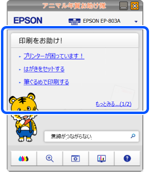 お使いのはがき印刷ソフトウェアやプリンターの状態に応じて、印刷方法やインクの交換方法、困ったときのサポート情報やリンクが表示されます。