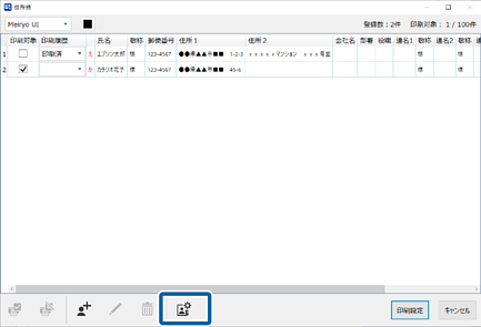 宛名面の印刷設定画面で[住所録]をクリックします。