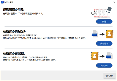 印刷履歴の削除、作成した住所録の書き出し、Epson Photo+や「スマホでカラリオ年賀」、その他の年賀状アプリで作成した住所録を読み込むことができます。