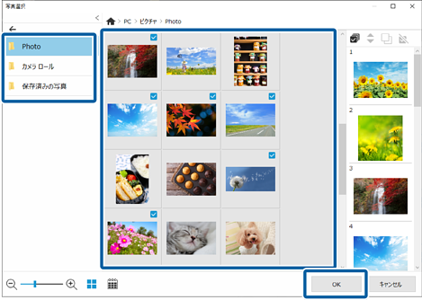 選択した写真は、右側の写真一覧で確認できます。