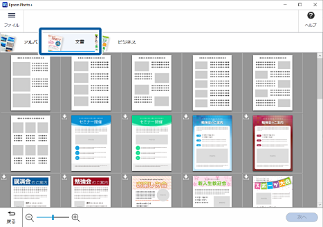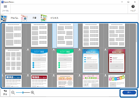 チラシやお便り用にデザインされたテンプレートを使って写真をレイアウトしたい場合は、[カテゴリー]の一覧からキーワードを選択してください。