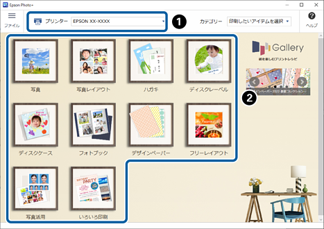 [カテゴリー]の一覧からキーワードを選択すると、キーワードに合ったテンプレートが表示されます。チラシ・フライヤーや学校・地域などのお便りを簡単に作成できます。