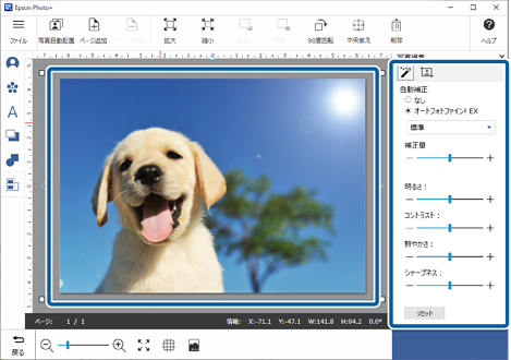 をクリックすると、写真の明るさやコントラストなどを調整できます。
