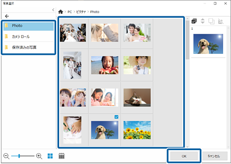 選択する写真に合わせて、自動で用紙の向きが設定されます。写真の向きを変更したい場合は、写真選択後に設定しなおしてください。詳しくは以下をご覧ください。