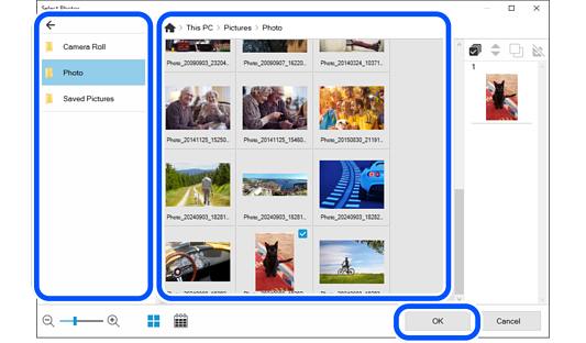 Framed photos are arranged in the order of the photo list. Use the following buttons to edit the contents of the photo list.