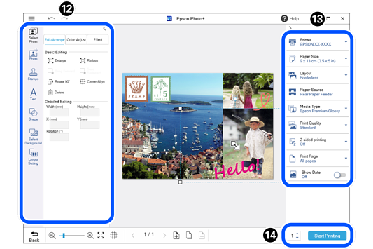 : Add stamps and text. You can also adjust the position and size of photos and added items.