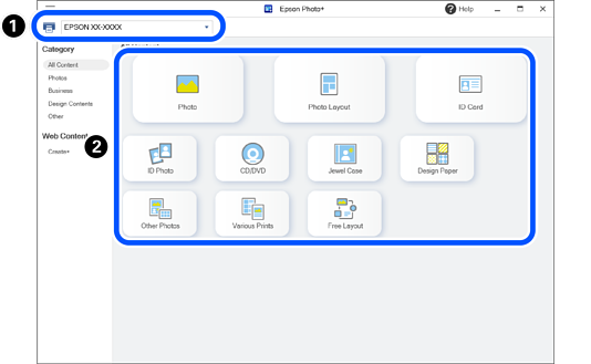 To select and print content provided by Epson on the Internet, select Web Content.