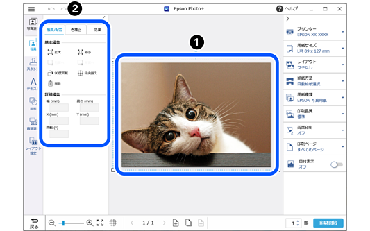 選択した写真またはアイテムの位置(中央原点からの距離)を調整します。 Xは横方向、Yは縦方向を示します。 |