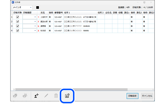 宛名面の印刷設定画面で[住所録]をクリックします。