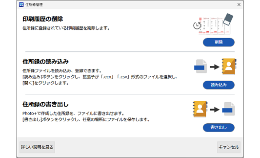 印刷履歴の削除、作成した住所録の書き出し、Epson Photo+や「スマホでカラリオ年賀」、その他の年賀状アプリで作成した住所録を読み込むことができます。