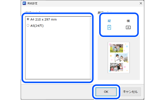 用紙サイズと向きを選択して、[OK]をクリックします。