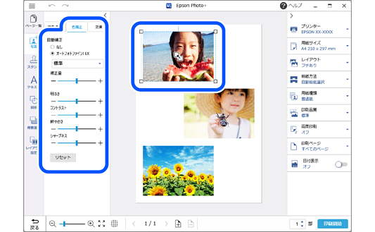 写真を選択して[色補正]タブを選択すると、写真の明るさやコントラストなどを調整できます。