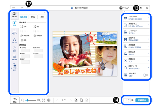 : スタンプやテキストを追加します。また、写真や追加したアイテムの位置や大きさを調整します。