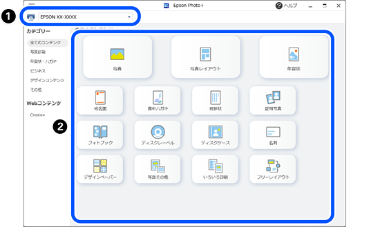 [Webコンテンツ]を選択すると、エプソンがウェブ上で提供する印刷コンテンツを選んで印刷できます。