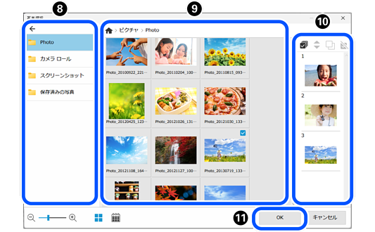 )の順番通りに配置されます。写真一覧の内容は以下のボタンを使って編集します。