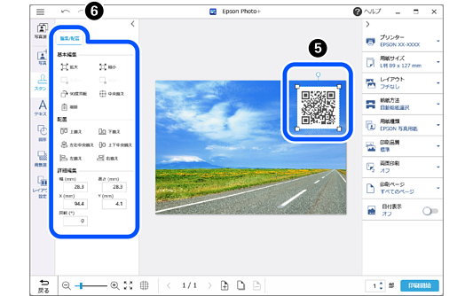 QRコードを選択して[編集/配置]タブを選択し、QRコードの大きさなどを調整します。