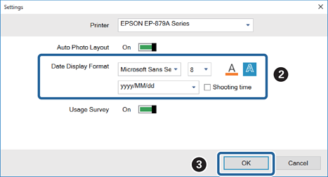 : Ändern Sie die Schriftart, die Größe, die Farbe usw. für Datumsanzeigeformat. Wählen Sie Aufnahmezeit, um nach dem Datum die Zeit hinzufügen, zu der das Foto aufgenommen wurde.