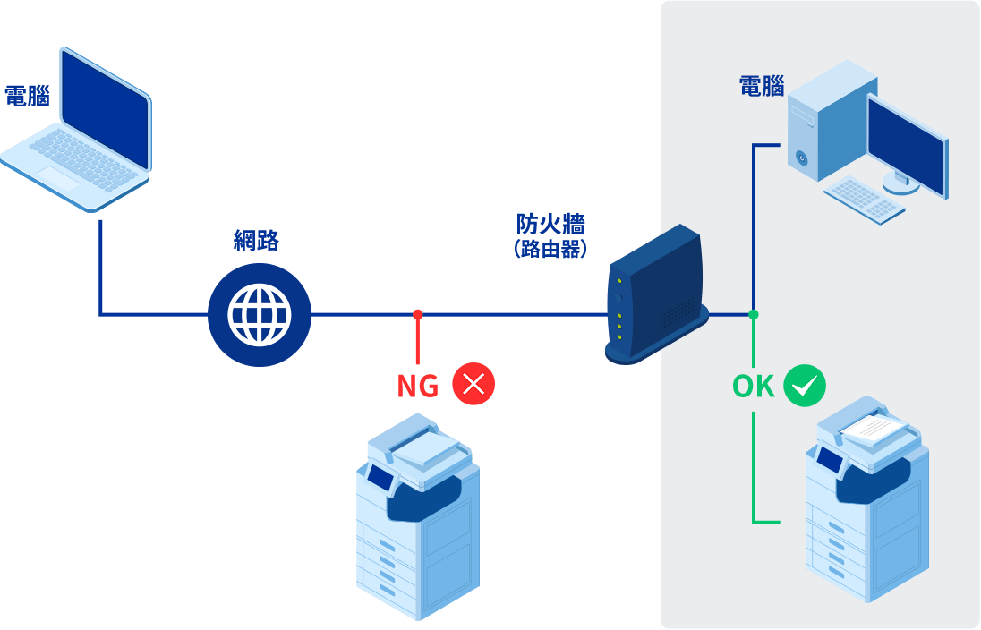 請勿將印表機、複合機、掃描器直接連接到網路,而是設置在受到防火牆保護的網路中。