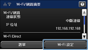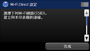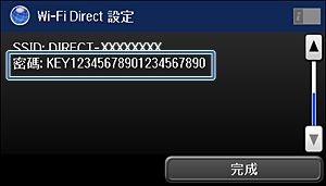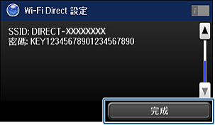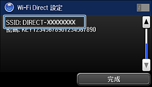 輸入在印表機控制面板上顯示的 SSID 與密碼。從智慧型裝置上的 Wi-Fi 畫面選擇在印表機控制面板上顯示的 SSID。